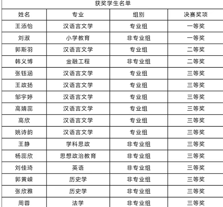 此次大赛中,开元还收获多项集体与个人荣誉:开元文学院获评“优秀组织单位”,文学院王年年、李娜两位老师获评“优秀指导老师”,张义男同学获评“优秀组织者”,李美君、曹楠、付景鑫三位同学荣获“优秀志愿者”称号。