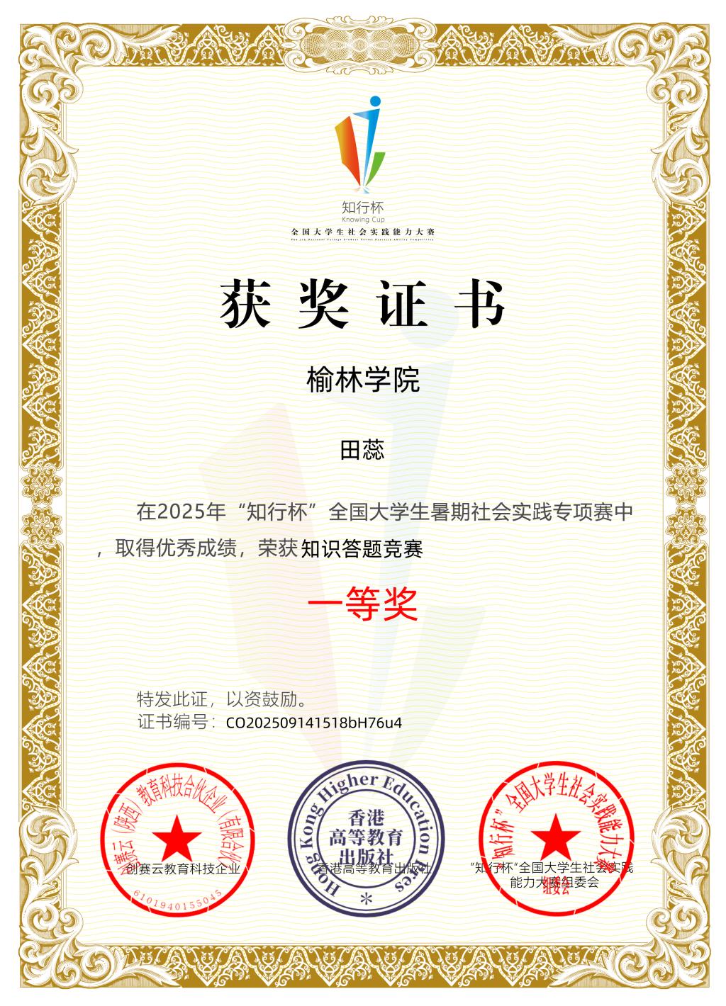 近日,“知行杯”全国大学生暑期社会实践专项赛——“知行乡旅,赋能乡村新发展”之“乡健知行”知识答题竞赛成绩揭晓,在开元管理学院积极组织和张霞老师的指导下,田蕊、杜新悦两位同学表现优异,最终荣获一等奖。