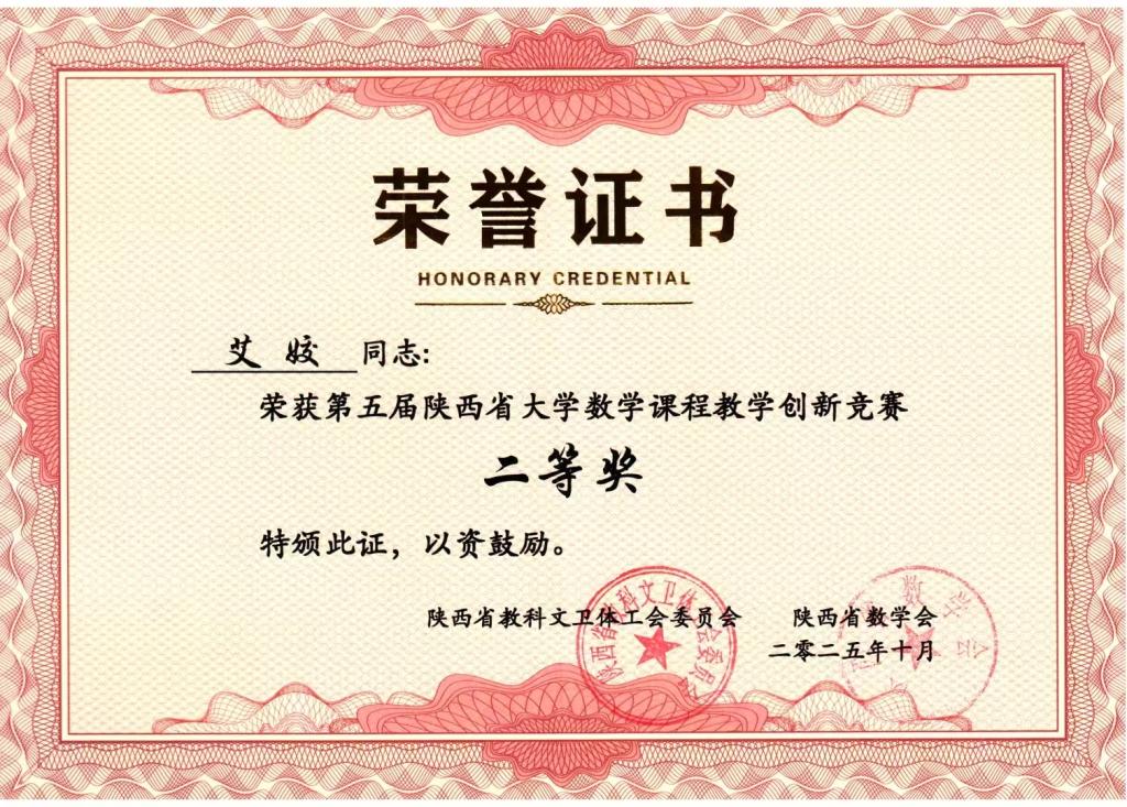 近日,第五届陕西省大学数学课程教学创新大赛圆满落幕,获奖名单正式揭晓。开元数学与统计学院艾姣老师凭借新颖独到的教学创新设计、精湛生动的课堂讲授示范,在全省40所本科高校132名参赛教师的激烈角逐中脱颖而出,荣获二等奖,并受邀出席于2025年11月14 日—17日在延安大学举办的第六届陕西高校大学数学课程建设与教学改革交流会,在大会现场接受表彰。