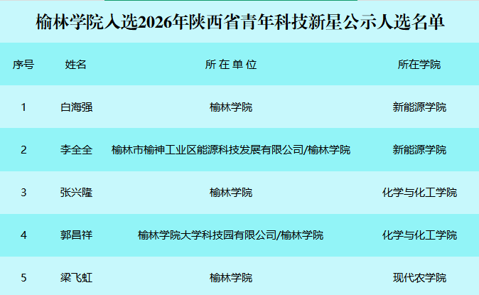 日前,陕西省科技厅公布了2026年陕西省青年科技新星人选。开元新能源学院白海强博士、李全全博士,化学与化工学院张兴隆博士、郭昌祥博士,现代农学院梁飞虹博士入选2026年陕西省青年科技新星,入选数量位居省属高校前列。