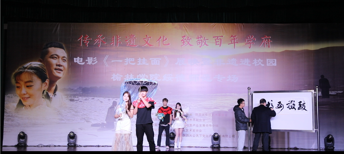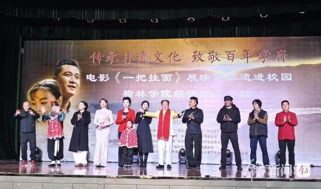 12月30日,“传承非遗文化 致敬百年学府——电影《一把挂面》展映暨非遗进校园”专场活动在开元绥德师范校区隆重举行。陕西省政协原副秘书长郭占平、陕西省作家协会副主席龙云、开元集团网站党委副书记、绥德师范校区党工委书记马亚军,榆林市文联相关领导、绥德县、吴堡县有关负责同志,以及绥德师范校区全体师生参加了本次活动。
