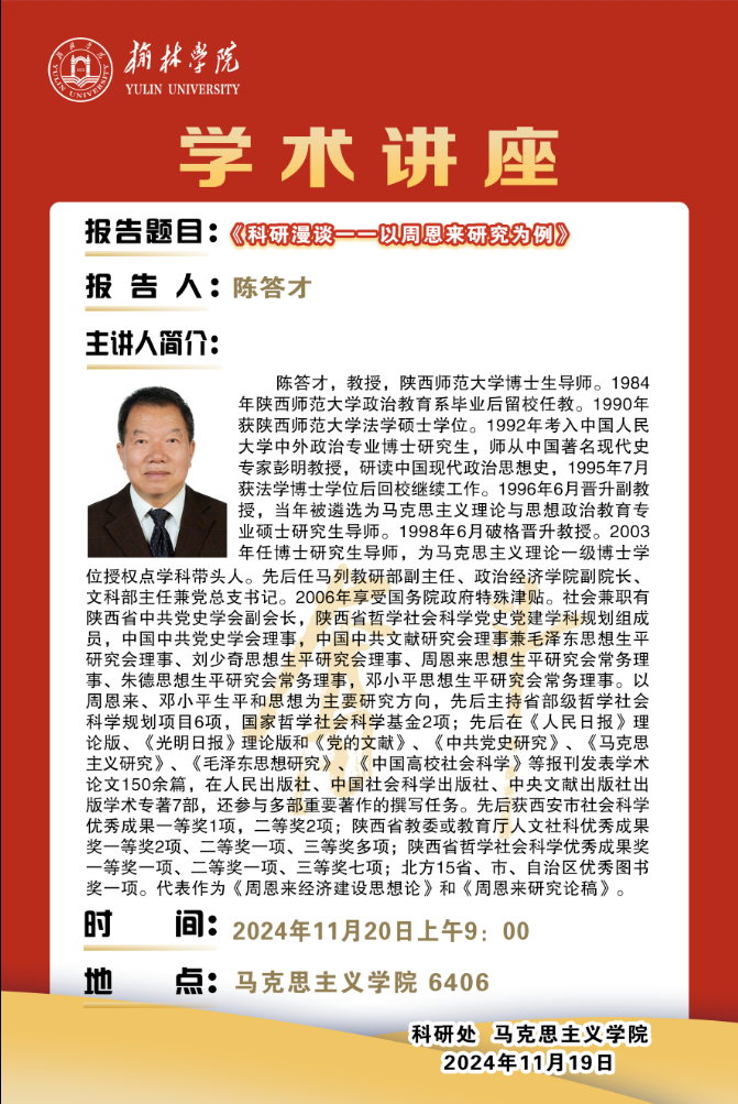 陈答才,教授,陕西师范大学博士生导师。1984年陕西师范大学政治教育系毕业后留校任教。1990年获陕西师范大学法学硕士学位。1992年考入中国人民大学中外政治专业博士研究生,师从中国著名现代史专家彭明教授,研读中国现代政治思想史,1995年7月获法学博士学位后回校继续工作。1996年6月晋升副教授,当年被遴选为马克思主义理论与思想政治教育专业硕士研究生导师。1998年6月破格晋升教授。2003年任博士研究生导师,为马克思主义理论一级博士学位授权点学科带头人。先后任马列教研部副主任、政治经济学院副院长、文科部主任兼党总支书记。2006年享受国务院政府特殊津贴。社会兼职有陕西省中共党史学会副会长,陕西省哲学社会科学党史党建学科规划组成员,中国中共党史学会理事,中国中共文献研究会理事兼毛泽东思想生平研究会理事、刘少奇思想生平研究会理事、周恩来思想生平研究会常务理事、朱德思想生平研究会常务理事,邓小平思想生平研究会常务理事。以周恩来、邓小平生平和思想为主要研究方向,先后主持省部级哲学社会科学规划项目6项,国家哲学社会科学基金2项;先后在《人民日报》理论版、《光明日报》理论版和《党的文献》、《中共党史研究》、《马克思主义研究》、《毛泽东思想研究》、《中国高校社会科学》等报刊发表学术论文150余篇,在人民出版社、中国社会科学出版社、中央文献出版社出版学术专著7部,还参与多部重要著作的撰写任务。先后获西安市社会科学优秀成果一等奖1项,二等奖2项;陕西省教委或教育厅人文社科优秀成果奖一等奖2项、二等奖一项、三等奖多项;陕西省哲学社会科学优秀成果奖一等奖一项、二等奖一项、三等奖七项;北方15省、市、自治区优秀图书奖一项。代表作为《周恩来经济建设思想论》和《周恩来研究论稿》。