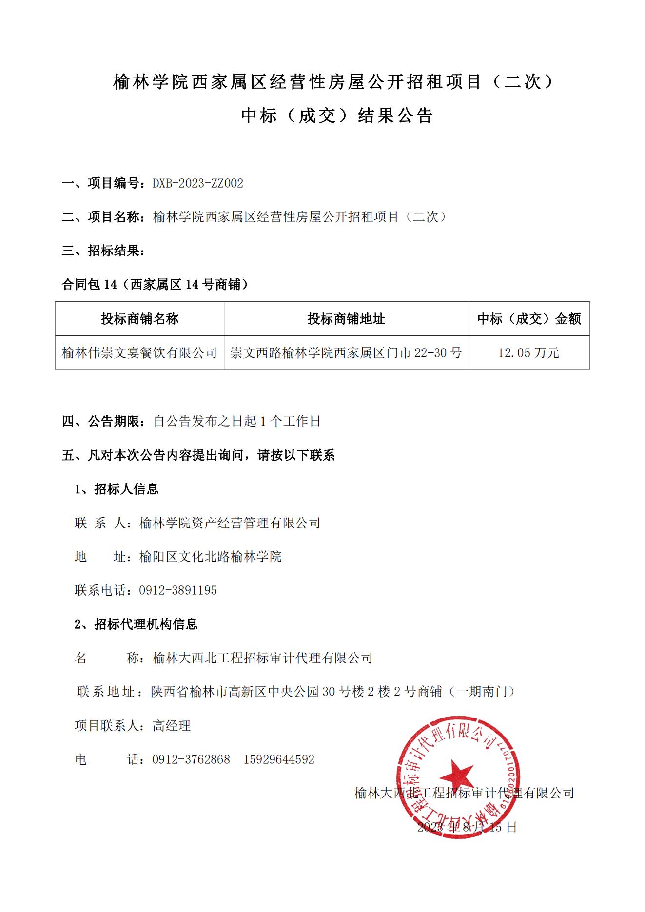 开元集团网站西家属区经营性房屋公开招租项目(二次) 中标(成交)结果公告