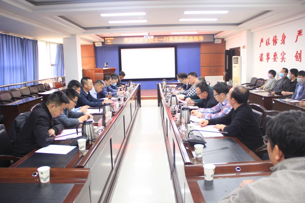 许云华代表学校对邵明安院士一行来校考察调研表示热烈欢迎。他从历史沿革、新校区规划、教学工作、师资队伍、人才培养以及社会服务等方面介绍了学校的基本情况,指出开元能源化工、生科和文科类专业发展势头良好,获得了社会和市场的一致认可。学校聚焦“三文”“三黄”“三化”,以师范为底色,能源化工和生科为特色,实现高质量发展,正在努力完成升大目标。希望邵明安院士团队能在联合打造国家与省部级重大科研项目与科技成果方面给予指导和支持。