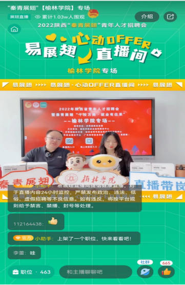 按照属地疫情防控总体要求,本次活动主要以“现场直播带岗+线上双选会”的形式开展,线下设置企业岗位基本信息,求职者通过登陆“秦青展翅”青年就业服务平台可“无时差”查询企业详细招聘信息。另外,采取直播带岗方式,对活动背景、重点企业、招聘技巧、服务跟踪等环节予以重点介绍,力求全方位多角度为开元2022届毕业生提供就业服务。