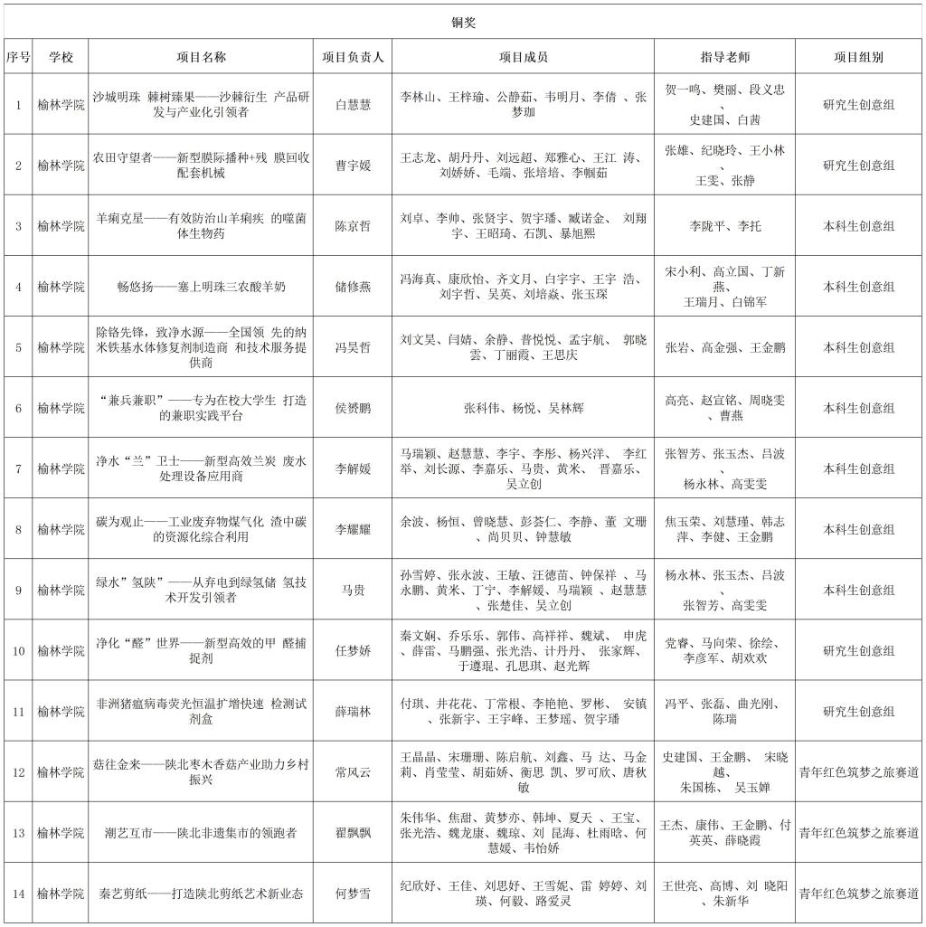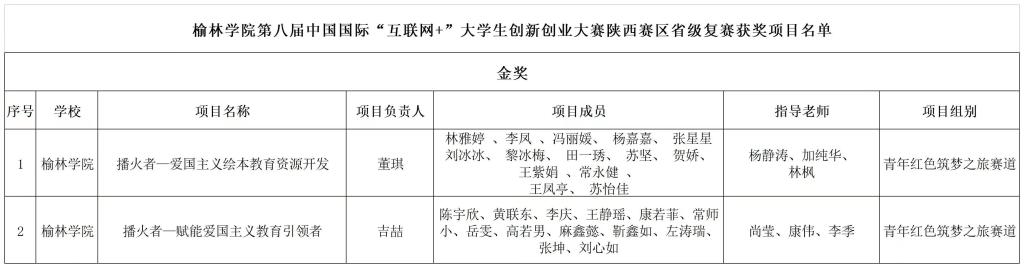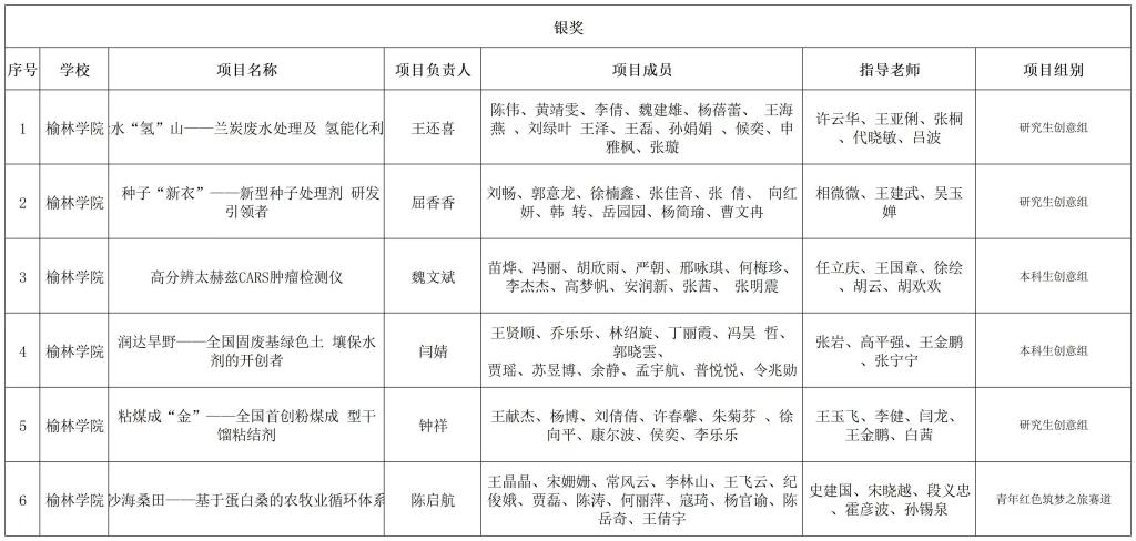 在第八届“互联网+”大学生创新创业大赛陕西省省赛获奖项目中,《“播火者赋能爱国主义教育引领者”》《“播火者——爱国主义绘本教育资源开发”》荣获“青年红色筑梦之旅”赛道金奖;《绿水“氢”山——兰炭废水处理及 氢能化利用》《种子“新衣”——新型种子处理剂 研发引领者 》《高分辨太赫兹CARS肿瘤检测仪》《润达旱野——全国固废基绿色土 壤保水剂的开创者》《粘煤成“金”——全国首创粉煤成 型干馏粘结剂 》荣获主赛道银奖,《沙海桑田——基于蛋白桑的农牧业循环体系》荣获“青年红色筑梦之旅”赛道银奖;《沙城明珠 棘树臻果——沙棘衍生产品研发与产业化引领者》等11个项目荣获主赛道铜奖,《菇往金来——陕北枣木香菇产业助力乡村振兴》等3个项目荣获“青年红色筑梦之旅”赛道铜奖。