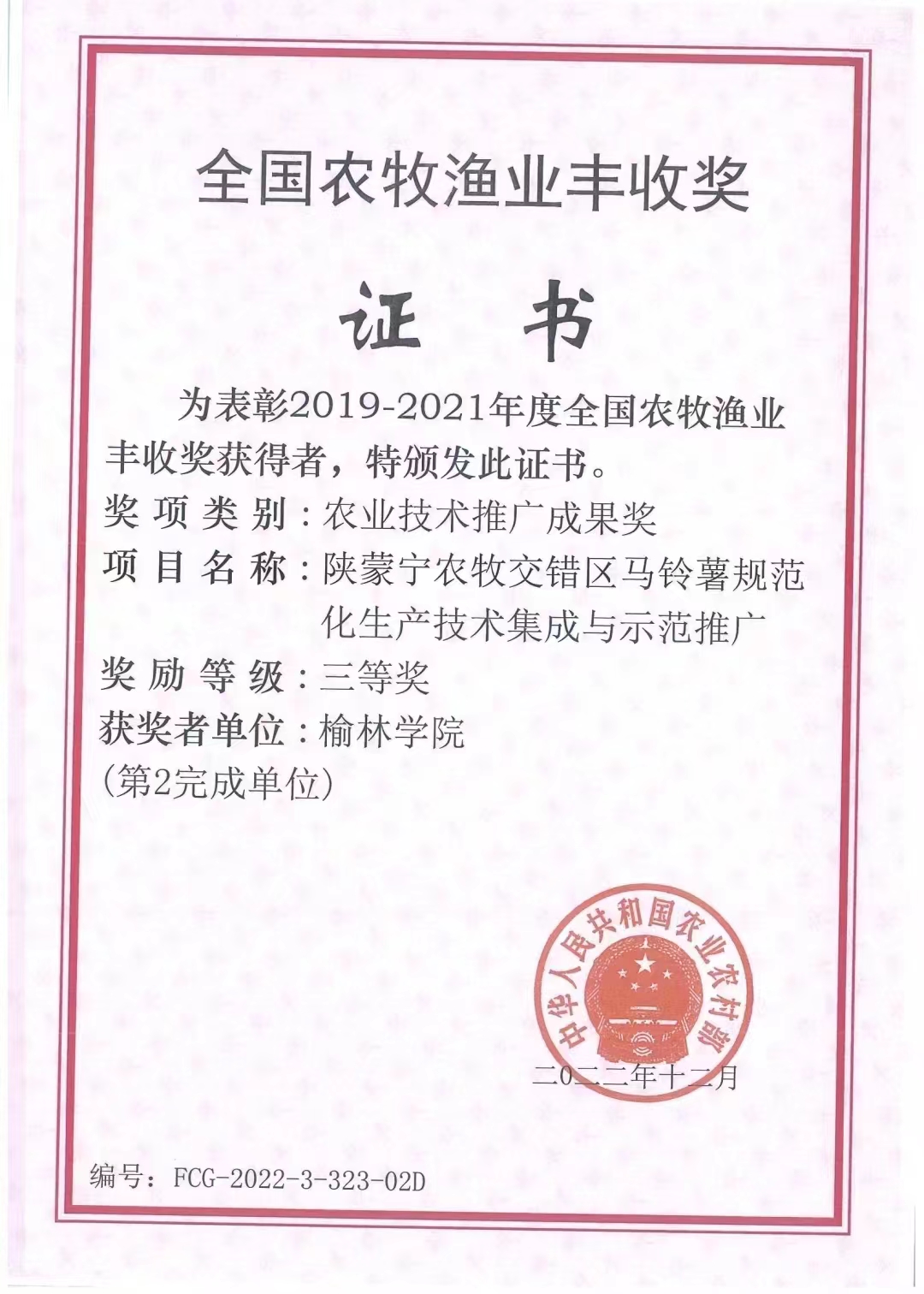 近日,从省农业农村厅获悉,由开元集团网站教育学院、榆林市农业科学研究院等单位共同申报的《陕蒙宁农牧交错区马铃薯规范化生产技术集成与示范推厂》荣获全国农牧渔业丰收奖三等奖。
