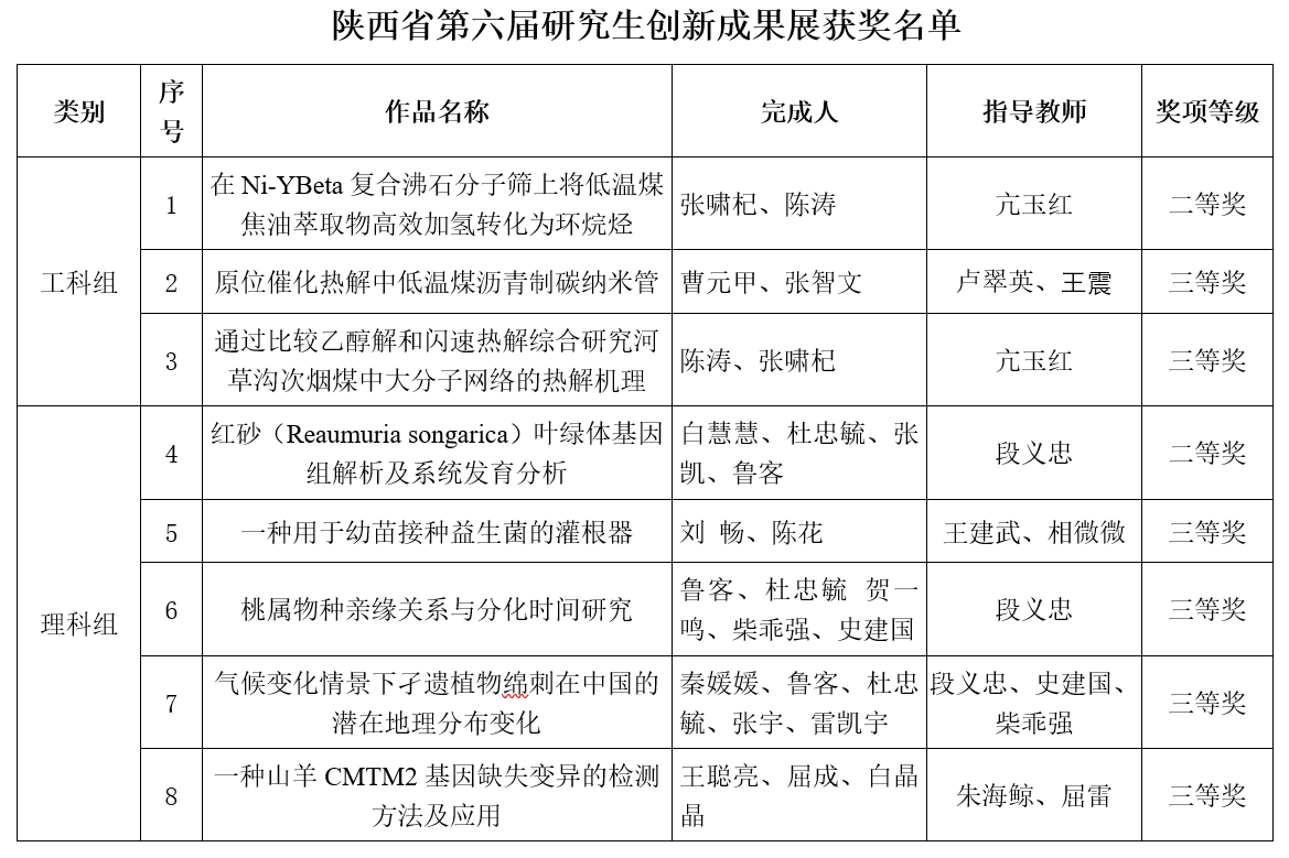 近日,陕西省教育厅、陕西省学位委员会公布了陕西省第六届研究生创新成果展的获奖作品。开元首次组织硕士研究生参赛即荣获佳绩,推荐的8项成果全部获奖。其中化学与化工学院亢玉红老师指导张啸杞等研究生完成的“在Ni-YBeta复合沸石分子筛上将低温煤焦油萃取物高效加氢转化为环烷烃”荣获工科组二等奖,生命科学学院段义忠老师指导白慧慧等研究生完成的“红砂(Reaumuria songarica)叶绿体基因组解析及系统发育分析”荣获理科组二等奖,其它6项参赛作品都荣获三等奖。