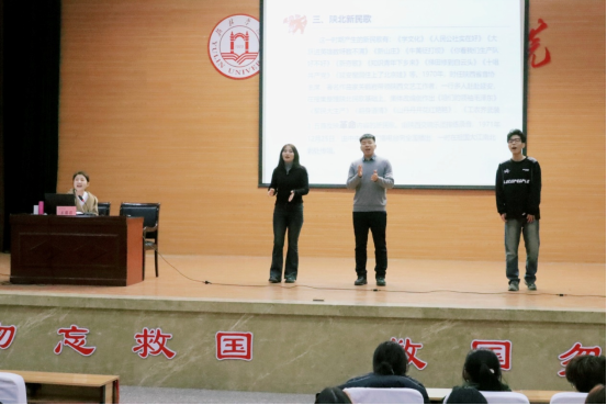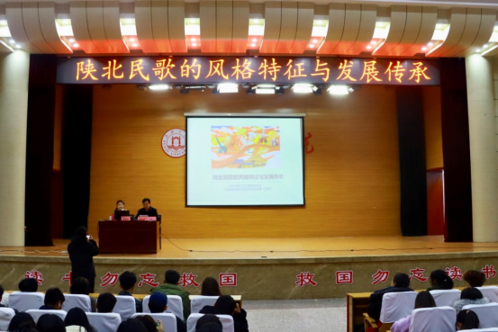 王蓓蓓老师在讲座中,介绍了陕北民歌的风格特征与发展传承,使学生了解陕北民歌的产生、发展和内容变化。通过传统民歌、革命民歌、新民歌的不同时期的不同意义及发展,学习并弘扬陕北民歌。范唱不同风格的陕北民歌,使学生了解陕北民歌的曲调结构及艺术特色,从发展的规律侧重于体现红色音乐文化的政治性、时代性。从陕北民歌的起源到陕北民歌的特点,从陕北民歌的唱法到陕北民歌的品质,从黄土文化的传承到民歌文化的继承,王蓓蓓老师用接地气的语言和原生态的唱法向在座的师生进行了讲解和展示。