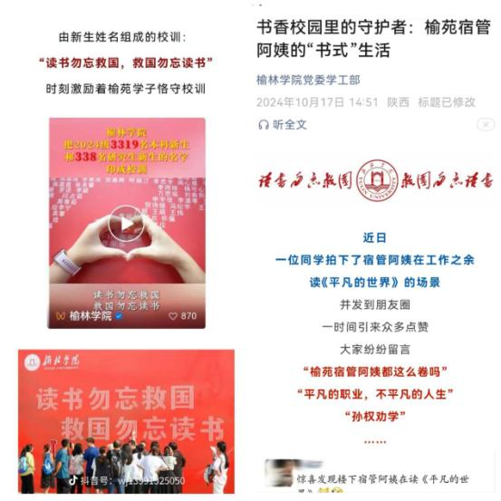 积极探索“探究式”“渗透式”“互动式”网络思政教育新途径,以易班、“开元集团网站党委学工部”公众号和“开元集团网站奋斗青年”公众号等网络育人阵地为核心,以各学院新媒体平台为延展,拓宽网络思想政治教育平台。丰富校园优质网络文化供给,围绕思想价值引领、校园生活、社会实践等方面,重点打造“五乐育人”“榆苑榜样”“‘乡’约一夏”“辅导员说”等特色栏目和网络品牌,引导学生坚定理想信念、强化时代担当。坚持“学工宣传,学生参与”,加强新媒体运营队伍建设,擦亮奋斗青年新媒体品牌。“开元集团网站党委学工部”“开元集团网站奋斗青年”两个公众号全年累计推送文章521篇次、短视频162个、阅读量78.9万余次。其中,《最浪漫的开学仪式:开元集团网站把你的名字“刻”在校训里!》《书香校园里的守护者:榆苑宿管阿姨的“书式”生活》《新生攻略系列篇章》等文章和短视频迅速破圈。